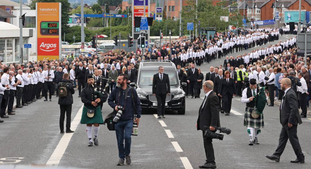 Ms O’Neill has said she did everything she could to minimize numbers including encouraging thousands to watch it online while marshals kept the crowds away from the cortege during the journey through west Belfast.