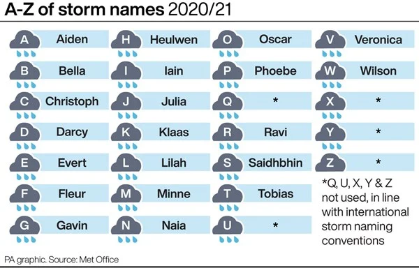 Bella, Gavin, Julia, Minnie, Oscar, Ravi, Saidhbhin and Wilson are among the storm names for 2020-21 announced by Met Éireann, along with the UK Met Office and the Dutch national weather forecasting service, the Royal Netherlands Meteorological Institute (KNMI).