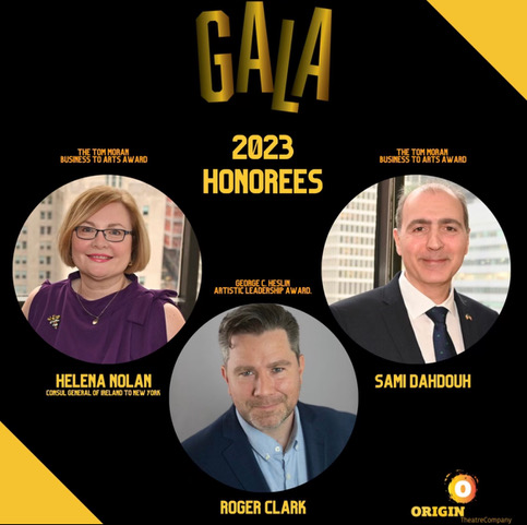 This came to me from the Origin Theatre Company to let you know about their Gala that will be held on Monday October 30: “We are thrilled to announce Origin’s Honorees for this year’s Gala event on October 30th at the magnificent Manhattan Penthouse in New York City. The Tom Moran Business to Arts Award will be presented to Consul General Helena Nolan and her husband Sami Dahdouh for their exceptional contribution to Irish arts, culture and theatre in our community in New York. The George C. Heslin Artistic Leadership award will also be presented to Irish American actor Roger Clark, aka Arthur Morgan, for his outstanding work in the theatre, film and motion caption industries.