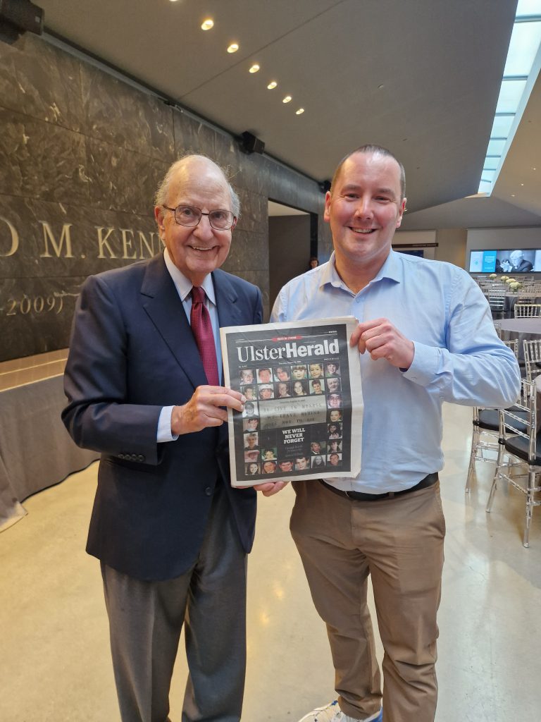 Mr Mitchell, now aged 90 years old, told the Irish Examiner USA of his pride at naming his new-born daughter Claire, after a survivor of the Omagh bombing. Aspiring pianist Claire Gallagher was blinded in the 1998 attack which exploded some 4 months after the Agreement was signed. The former Senator posed with a commemorative media front page dedicated to the Omagh survivors, co-written by this correspondent.