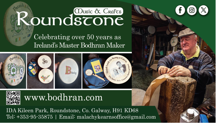 On the coast of Connemara, approximately an hour’s drive from Galway City, there is a charming 19th century fishing village called Roundstone. The village is full of colorful houses along the Atlantic and the imposing Connemara Mountains. At the end of the main road (I dare say perhaps it is the only road in the village) there is an old Franciscan monastery and right beside it a sign that says Roundstone Music & Craft, the shop/studio of bodhrán maker Malachy Kearns, also known as “Malachy Bodhrán”.