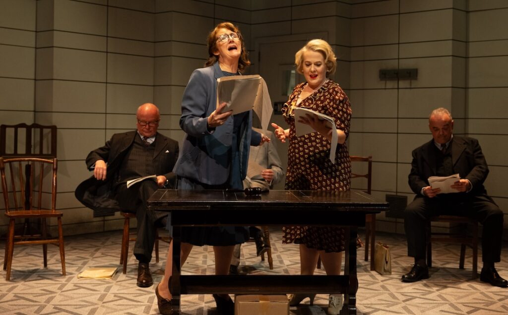 It’s this test case which is the focus of Murphy’s play, conceived originally for radio and adapted for a full stage production. The date is December 8, 1933, and it’s set in CBS Radio’s New York studio, preparing to go live on air with an episode of the dramatized newsreel, “March of Time.” This time it’s about the court case, “The United States versus One Book Called Ulysses.” Inside this basis of a radio broadcast, Murphy and director Conall Morrison insert two other levels of narrative, each depicted with a slightly skewed visual and dramatic style.
