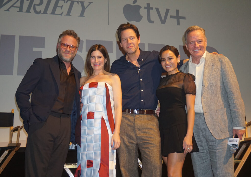 In addition, Ike Barinholtz, Chase Sui Wonders, and Kathryn Hahn who all play supporting roles, joined Rogen at an event in March after the show had debuted. Barinholtz plays Sal Saperstein, Continental’s vice president of production and Matt’s close friend. Wonders plays Quinn Hackett, Matt’s former assistant who he promotes to junior executive. Hahn, as Maya Mason, is Continental’s head of marketing. And Bryan Cranston plays Continental’s CEO Griffin Mill.