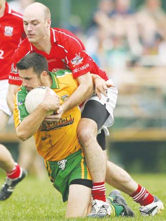 Midfield struggle: Donegal's big man Donal McNulty fends off Cork midfielder Kieran Connelly (Neil McDaid)