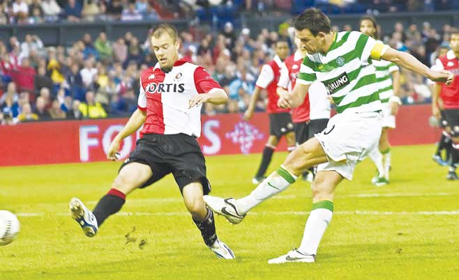 Jan Vennegoor of Hesselink (right) scores his second and Celtic's third goal against Feyenoord (SNS)