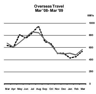 In March, the number of trips abroad by Irish residents was down 15.4% to 563,700 compared to the same month in 2008. This brings the total number of trips abroad for the first quarter of 2009 to 1,539,800 which fell short of the same period in 2008 by 12.6%.