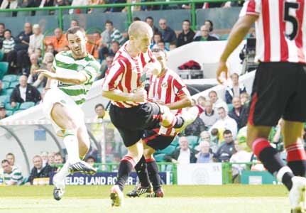 Marc Crosas (left) fires home for Celtic in their friendly against Sunderland at Parkhead last Saturday (SNS)