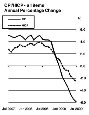 Consumer Prices in July, as measured by the CPI, decreased by 0.8% in the month. This compares to a decrease of 0.3% recorded in July of last year. As a result, prices on average, as measured by the CPI, were 5.9% lower in July compared with July 2008.