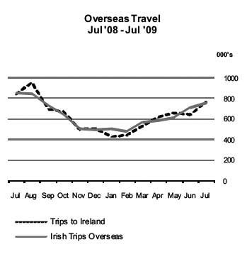 Irish trips abroad for the year to July 2009, at almost 4,200,000, were 10.1% less than the same period in 2008.