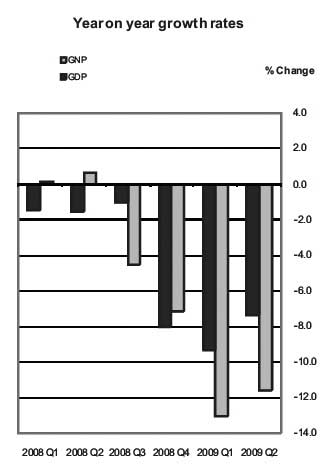 Initial estimates of Gross Domestic Product (GDP) and Gross National Product (GNP) for the second quarter of 2009 show year on year declines in both measures.