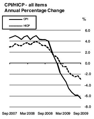 The EU Harmonised Index of Consumer Prices (HICP) also decreased by 0.4% in the month, compared to an increase of 0.3% in September of last year. As a result, prices on average, as measured by the HICP, were 3.0% lower in September compared with September 2008.