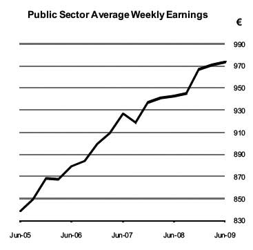 Over the four year period from June 2005 to June 2009, average weekly earnings in the Public Sector (excluding Health) rose by 16.1% from €838.35 to €973.09.