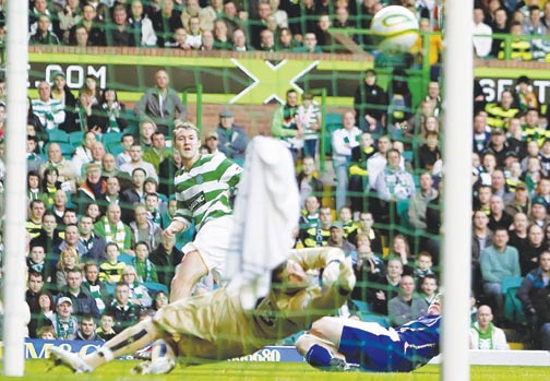 Keeper Cameron Bell (grounded) lies dejected after failing to stop Celtic's Georgios Samaras (9) scoring his side's second (SNS)