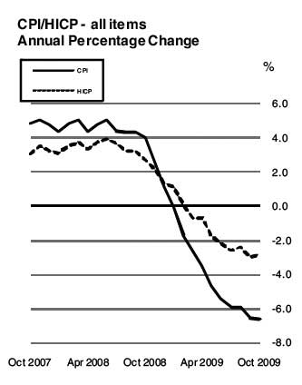 The EU Harmonised Index of Consumer Prices (HICP) also decreased by 0.2% in the month, compared to a decrease of 0.4% in October of last year. As a result, prices on average, as measured by the HICP, were 2.8% lower in October compared with October 2008.