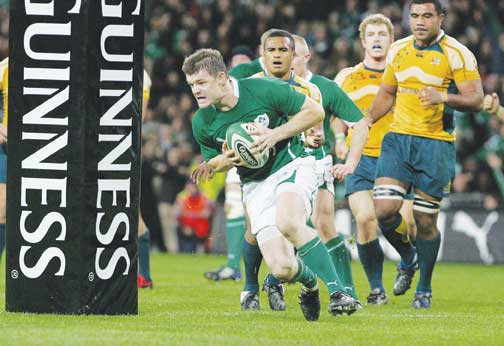 But Ireland again rose to the occasion and with some incisive touch kicking by O'Gara and Rob Kearney, the home side piled on the pressure. Ireland showed good hands from both the pack and the backs - a feature of their game throughout - and attacked Australia with every chance. O'Leary with a pass looked to have Bowe set up for the touch line, but the movement was judged to have been forward.