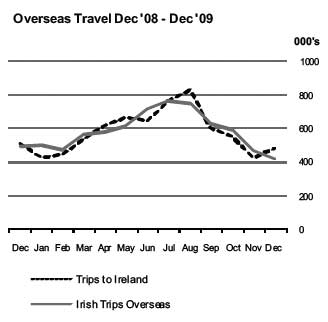 Meanwhile, trips to Ireland by overseas residents for December 2009 were down 6% to 473,600 from December 2008.