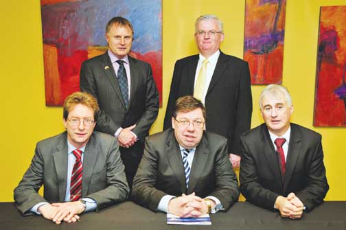 (front row, l-r): Dr Jim Browne, President NUI Galway; An Taoiseach, Brian Cowen, T.D.; Professor Brian Fitzgerald, Vice President Research, UL; (back row, l-r) John Hartnett, Chairman, ILTG, and Michael Leydon, Property Infrastructure and Energy Manager, Shannon Development.