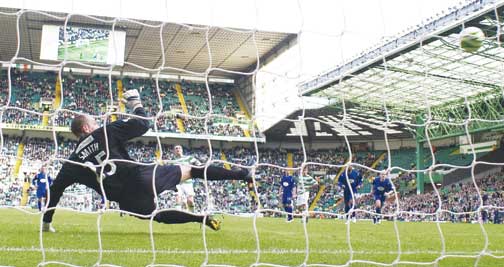 Robbie Keane (back) beats St. Johnstone keeper Graeme Smith (25) from the penalty spot to make it 2-0 (SNS)