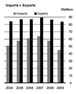 In December 2009 exports were €5,879 million, down €879 million (down 13%) on December 2008 and imports were €3,265 million, down €533 million.