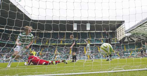Celtic ace Morten Rasmussen (left) wheels away after sealing a dramatic victory (SNS)