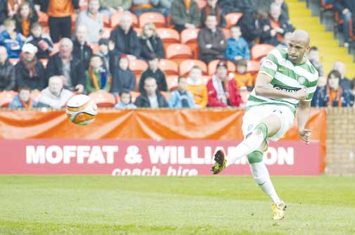 Celtic's Diomansy Kamara puts his side 1-0 ahead at Tannadice (SNS)