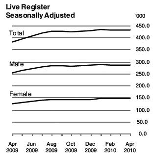 In the year to April 2010 there was an unadjusted increase in the Live Register of 50,781 (up 13.3%). This compares with an increase of 65,918 (up by 17.9%) in the year to March 2010.