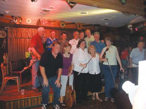 Joanie and the gang: Martin Connolly, Mary Coogan, Mike Rafferty, Willie Kelly, Father Charlie Coen, Liz Carroll, foot of Martin Mulhaire