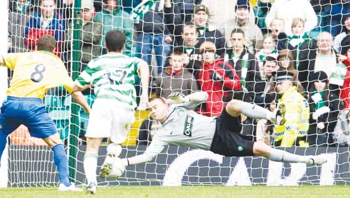 Artur Boruc saves a penalty from James McCarthur in the game against the Accies in April 2009 (SNS)