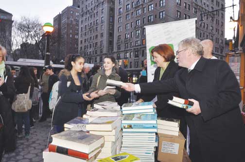 Our Woman of the Year for 2011, New York City Council Speaker Christine Quinn with Tanaiste Eamon Gilmore giving out free Irish books at 72nd and Broadway as part of the Irish Arts Center Book Day