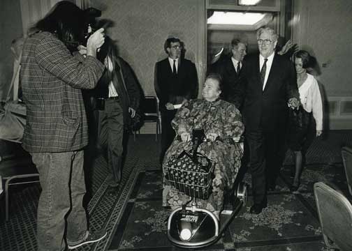 Former Fine Gael leader Garret Fitzgerald with his wife Joan at the Burlington Hotel in 1990. Austin Curry gives a wave while Jim Mitchell (left) looks on (Photocall)