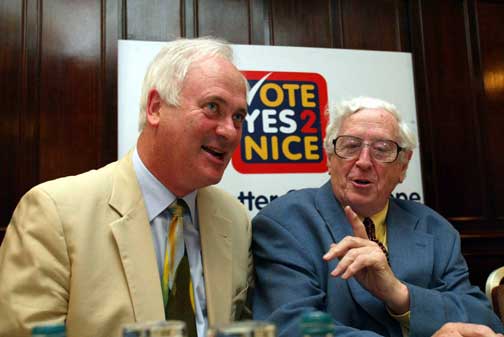 Former Taoiseach and FG leader Garrett Fitzgerald and Former Taoiseach and Fine Gael leader John Bruton TD (left) at a Vote Yes to Nice press conference at Buswell's Hotel, Dublin in 2002 (Photocall)
