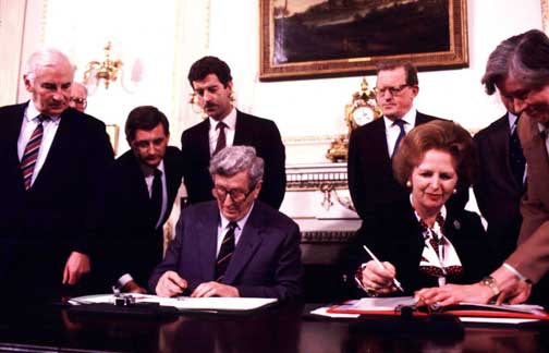 Taoiseach and FG Leader Dr Garrett Fitzgerald and British Prime Minister Margaret Thatcher signing the Anglo Irish Agreement in Hillsborough, outside Dublin, in 1985. In the background are Dick Spring (third left) and Tom King (second from right) (Photocall)