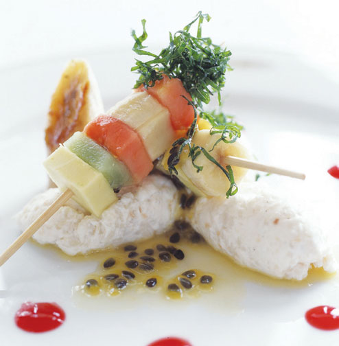 Peel the mango, papaya and kiwi and dice all the fruit to a medium size dice. Set the fruit on a large wooden stick, and set over the portion of rice pudding. Garnish with passion fruit puree and seeds.
