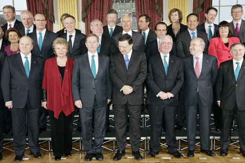 Pictured center is European Commission President Jose Manuel Barroso who has obviously noticed that Enda Kenny committed the ultimate faux-pas by standing on his own name tag. Note the smirks on the faces of his cabinet colleagues and the shocked look on the Taoiseach's face as he tries to work out how to extract himself from this awfully embarrassing situation (Photocall)