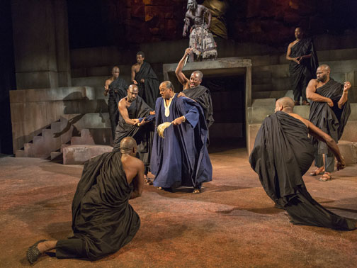And at first, when you enter the theatre at BAM's Harvey Theater, you think it's going to be really fresh. A band plays jaunty music, while a crowd dances, singing "Caesar!" A large bust faces upstage, against a background of corrugated tin. People carry stenciled signs with the word "Caesar" on them. The soothsayer comes on, dressed as a witch doctor in dreads and white makeup. The exuberant dancing captures a mob's happy spirit.