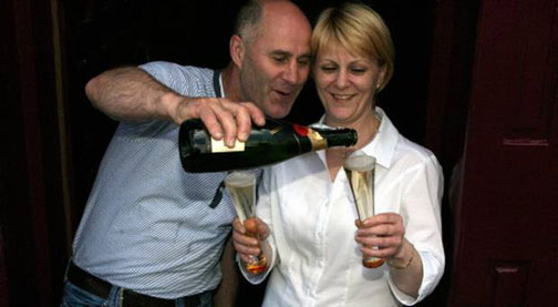 Lotto winners Kevin Geoghegan and Carol Loran celebrating outside Dolan's Bar, Mullingar (molloyphotography)