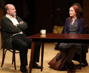 As the Rep’s sixth McPherson production, director Ciarán O’Reilly employs an intuitive understanding of the play to allow the actors to give such naturalistic performances. The others include “St. Nicholas” (2010), “The Weir” (2013 & 2015), “Port Authority” (2014), “Shining City” (2016), and “The Seafarer” (2018). This play has had a limited but sterling history, premiering in London’s Royal Court Theatre/Jerwood Theatre Downstairs in Spring of 2000 with Brian Cox ( Plunkett), Bronagh Gallagher (Mary) and Andrew Scott (Mark). Then, it opened Off-Broadway at the Atlantic Theater Company (running from February 20, 2003 to April 6, 2003) and was directed by McPherson himself with a sterling trio of Keith Nobbs, Jim Norton and Amy Ryan. Nominated for the 2003 Lucille Lortel Award, Best Play, Norton won the 2003 Obie Award, Performance. Then from Nov 6th, 2008 to January 4, 2009, it was produced by the Steppenwolf Theatre Company, in Chicago with this cast — William Petersen (John), Nicole Wiesner (Mary) and Stephen Louis Grush (Mark), and was directed by Amy Morton. Now the Rep adds to its place in New York’s theatrical history with this solid off-Broadway showcase.