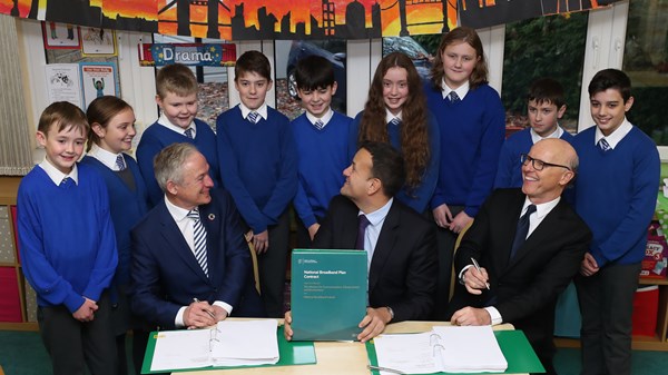 Taoiseach Leo Varadkar and Communications Minister Richard Bruton joined representatives from National Broadband Ireland, the consortium that will deliver the rollout, at the event at a school in Laragh on Tuesday. Government officials also attended.