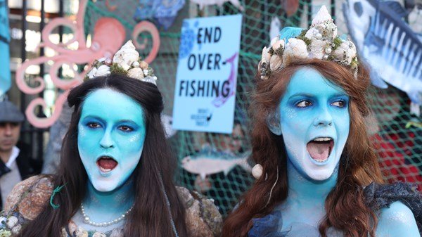 Two of the demonstrators were dressed as mermaids with costumes made of seashells, recycled items and fishing nets while others dressed as fishermen.