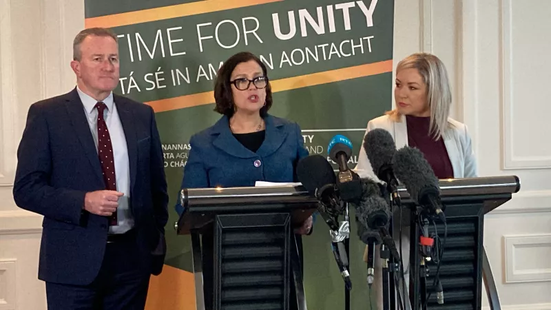 She was speaking alongside ministers Michelle O’Neill and Conor Murphy as First Minister Paul Givan announced his resignation as part of a protest at the Northern Ireland Protocol.