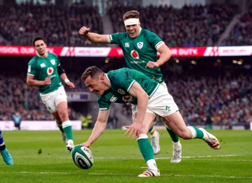 Fleet-footed Lowry, who excited the crowd all day, was then mobbed by the entire Irish team after crossing on a dream debut, before skipper O’Mahony marked his first Six Nations start since being sent off against Wales last year by diving over in the left corner to secure the bonus point.