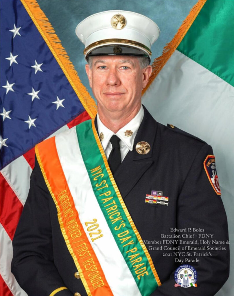 This came to me from The Grand Emerald Society Council who extended its heartfelt congratulations to Edward P. Boles, recipient of the GCUES 2020-2021 Irishman of the Year and Aide to the Grand Marshal, for his remarkable 32 years of steadfast dedication to FDNY, the citizens of New York City, and your invaluable contributions to the Labor and Emerald movement. “We wish you the best in your retirement and all your future endeavors,” they said, “Sláinte Eddie!”