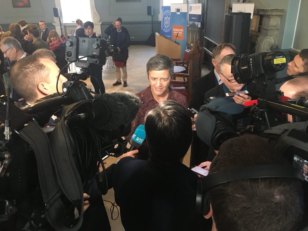 European Competition Commissioner Margrethe Vestager said the European Union and the European Parliament stand firm with Ireland throughout the Brexit process.