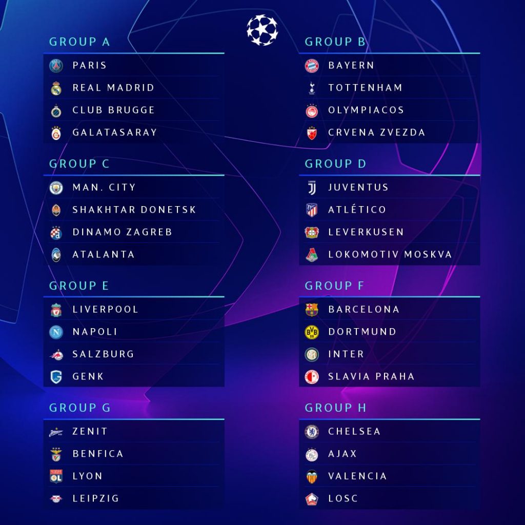 Italian champions Juventus take on Atlético Madrid, Bayer Leverkusen and Lokomotiv Moscow in Group D and Group G is made up of Zenit St Petersburg, Benfica, Lyon and RB Leipzig.